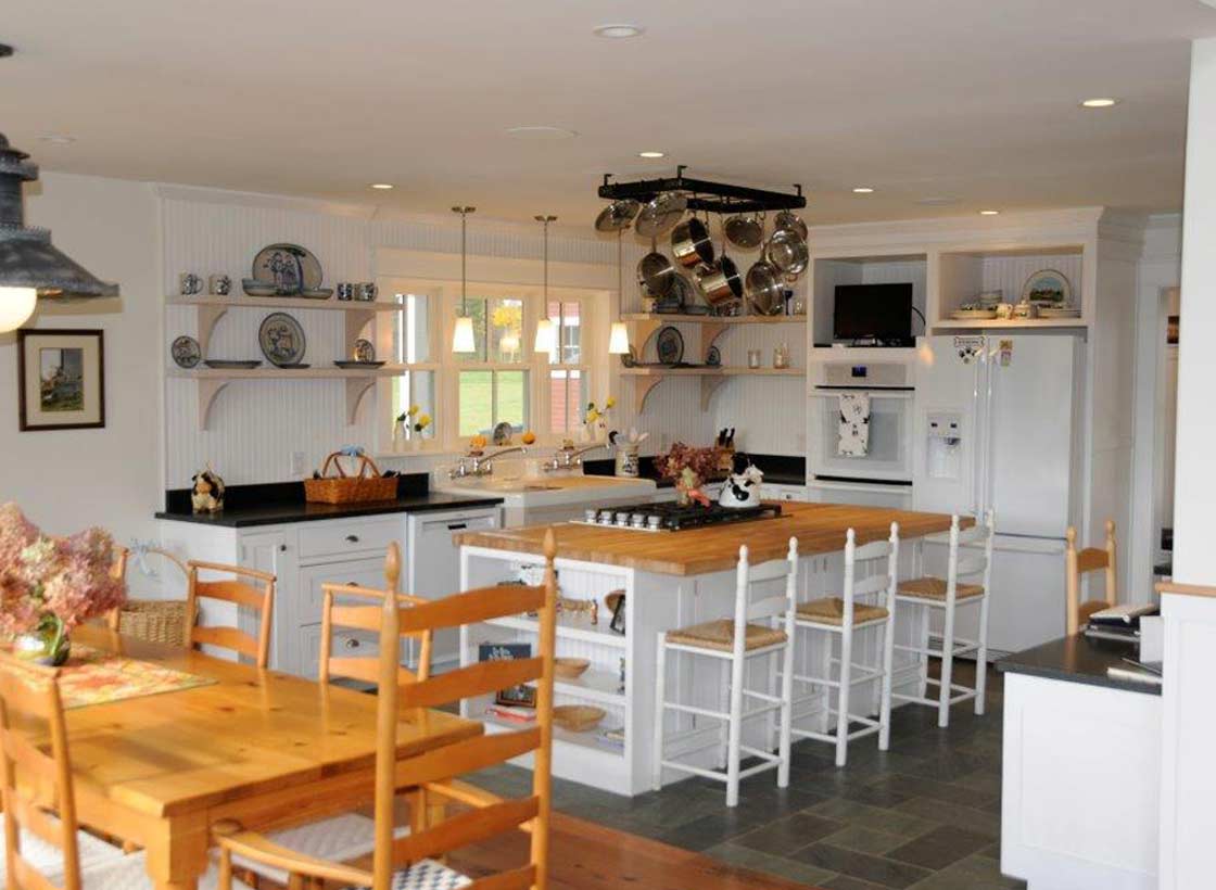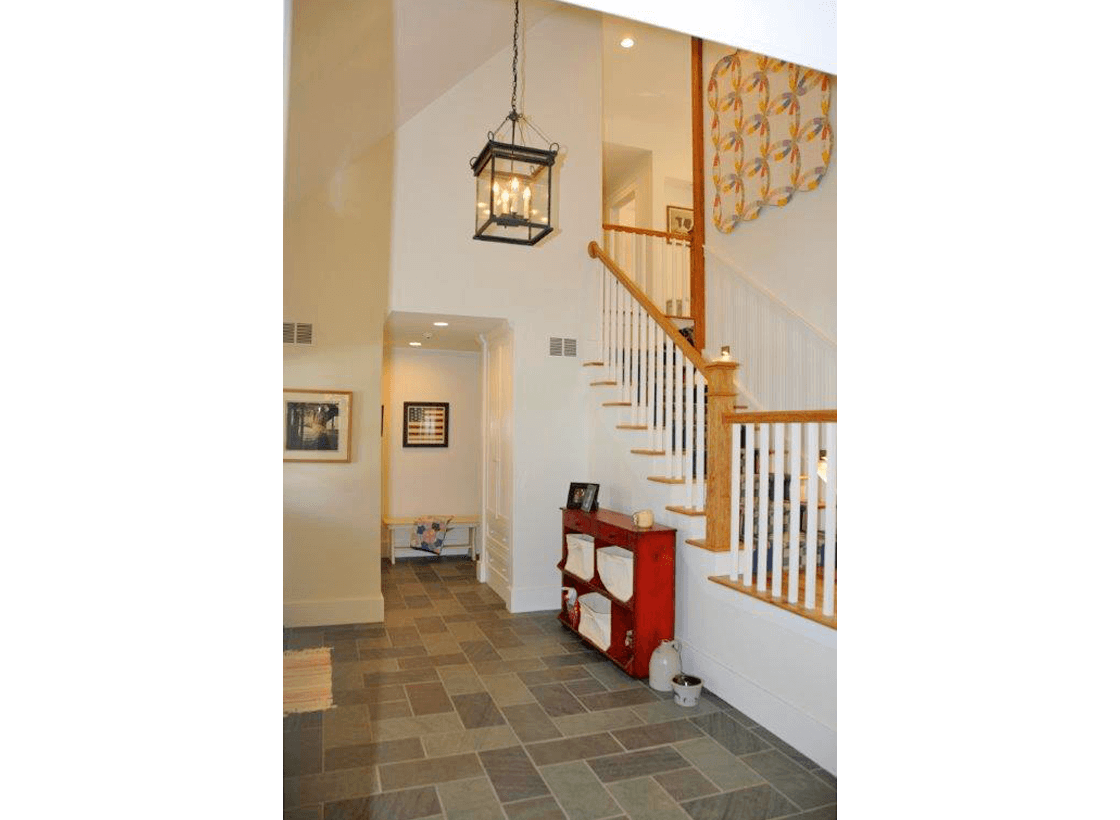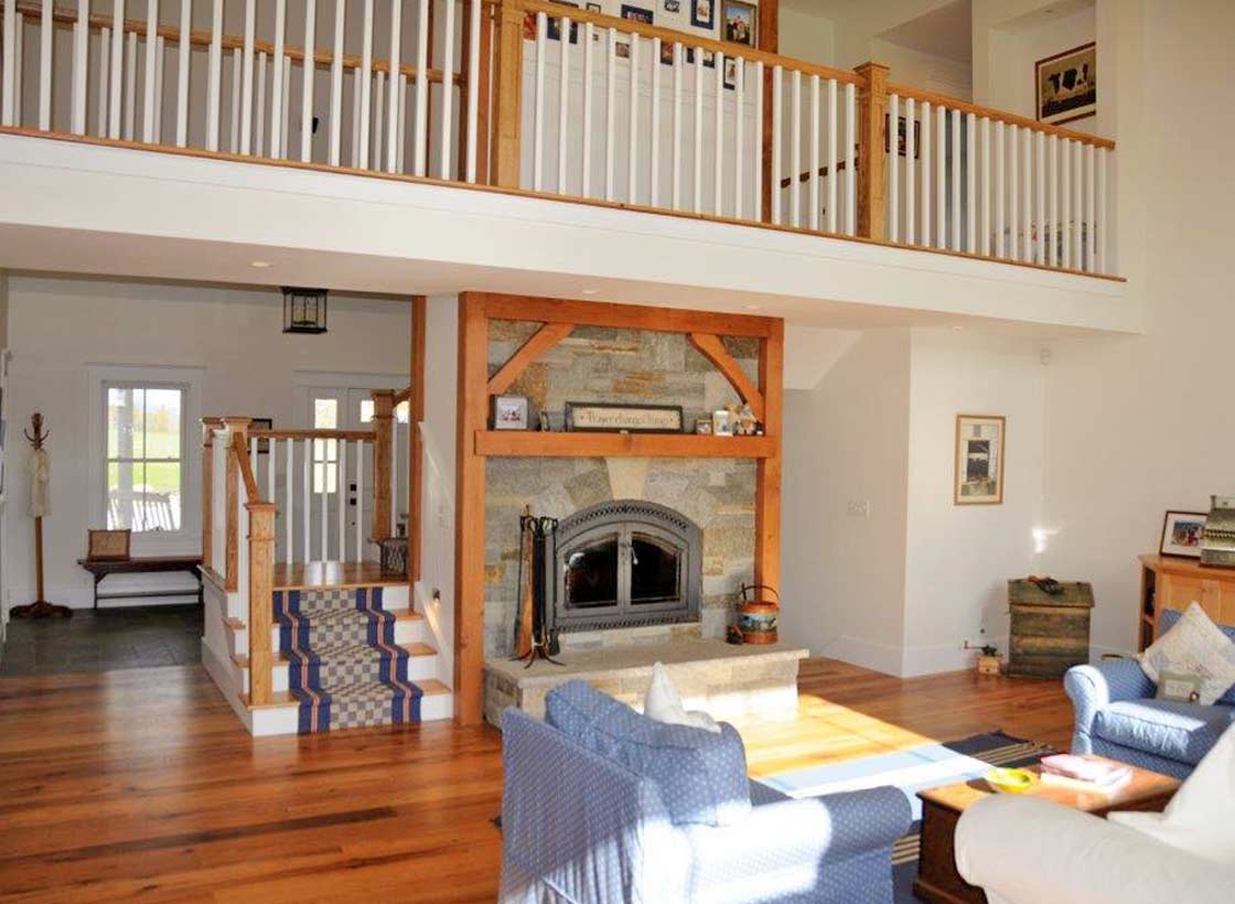 This home, like many Vermont homes, takes advantage of the hillsides and distant views. This tasteful, ‘downsized’ home straddles an old stone wall with a mountain view on one side that can be appreciated from all floors and the farm and hillside on the other. This energy efficient home has an open floor plan with a 2 story fireplace, a master suite on the main level and a home office and guest suite on the second level reached by a bridge.