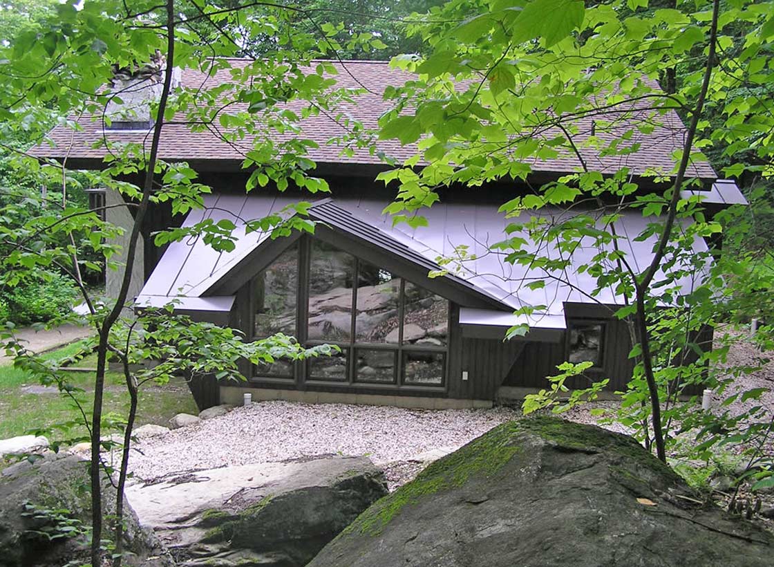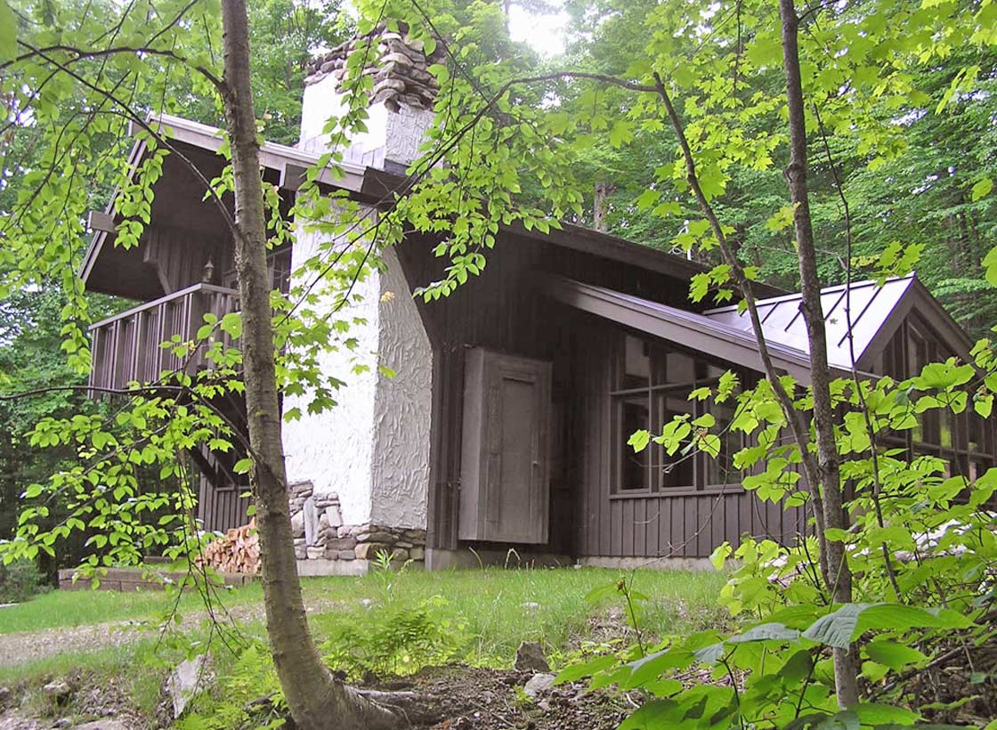 Wood siding, stucco and stone features make this Vermont vacation home hide-away a cozy nest to launch to the slope or retreat in warmth by a crackling fire.